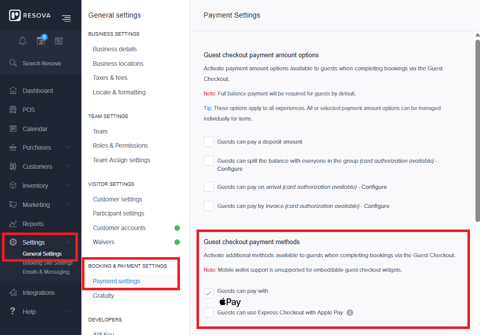 https://app.resova.us/settings/general/payments - Scroll to the Guest checkout payment methods section.