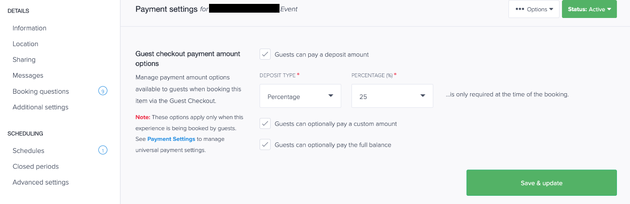 - Confirm “Guests can pay a deposit amount” is enabled globally