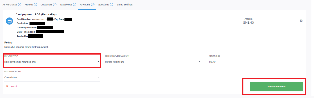 Add more information such as the Refund Reason and then click the Mark as refunded green button option.