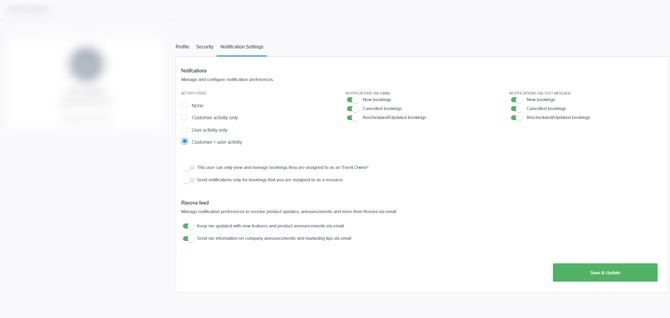If you’re not receiving notifications, you may need to enable the "Resova Feed" options in your own account. Notification preferences are managed individually, so each user can only view and update their own settings. That setting can not be altered by other users.