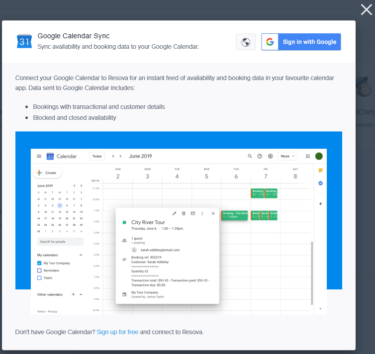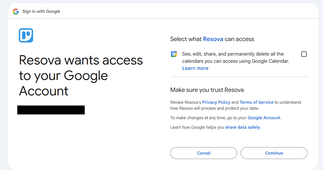 Google will prompt you to allow access so Resova can sync booking and availability data to your calendar.
