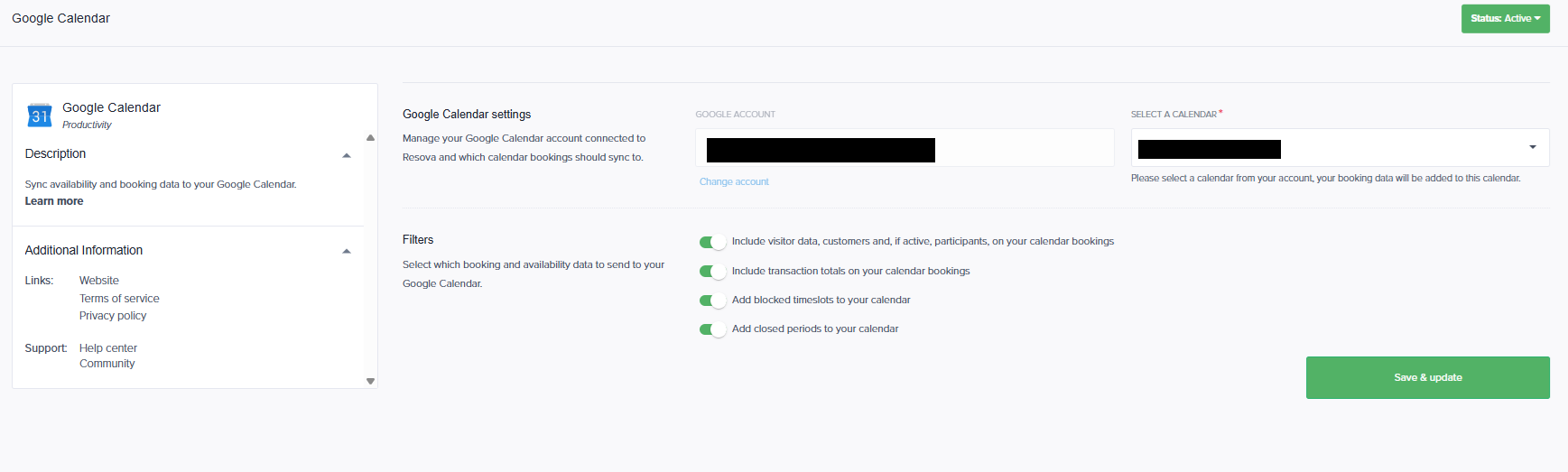 You can control what information Resova sends to your Google Calendar by enabling or disabling the available filters.