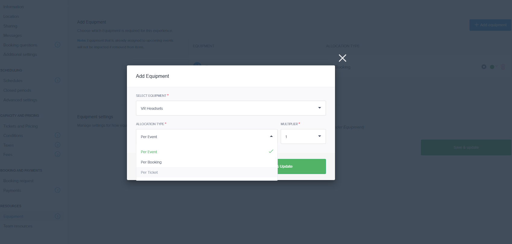 Multipliers define how many units of equipment are consumed per booking or ticket.